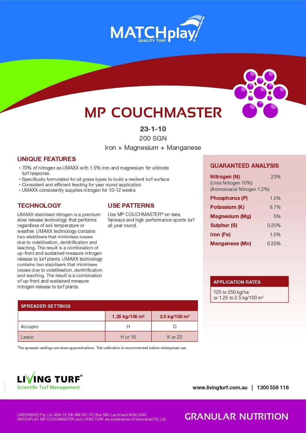 Matchplay Couchmaster is a high-performance granular fertiliser formulated to deliver fast and sustained turf response across all grass types. Featuring 70% of its nitrogen as UMAXX® stabilised nitrogen, this product ensures consistent feeding and strong, resilient turf for up to 12 weeks. Don’t be fooled by the name, it’s suitable for all grass types!