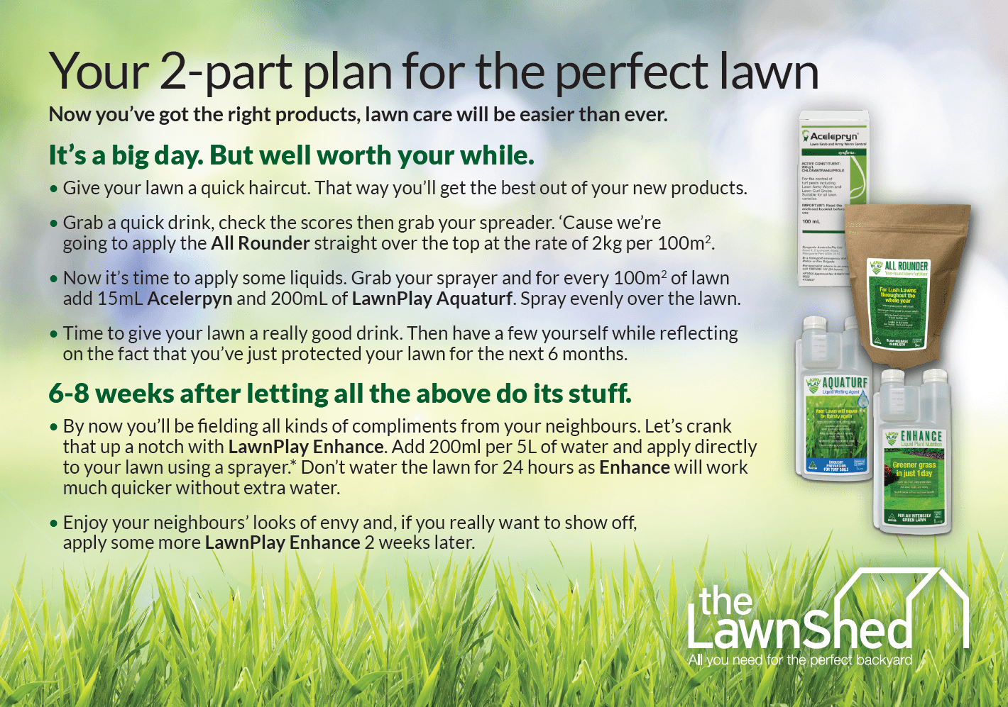 6 weeks later: Apply LAWN PLAY ENHANCE by adding 200ml to 5L of water and applying to 100m2. Now sit back and enjoy telling your neighbours how you did it.