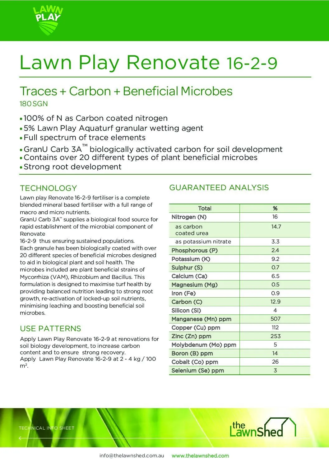 LAWN PLAY RENOVATE is a combination fertiliser and wetting agent. With a carefully selected Nitrogen source to deliver nutrition fast and repair damaged lawns, along with 15 other nutrients. With added soil biology, which contribute dramatically to repairing damaged soils including improving the ability to convert nutrition into lawn available forms