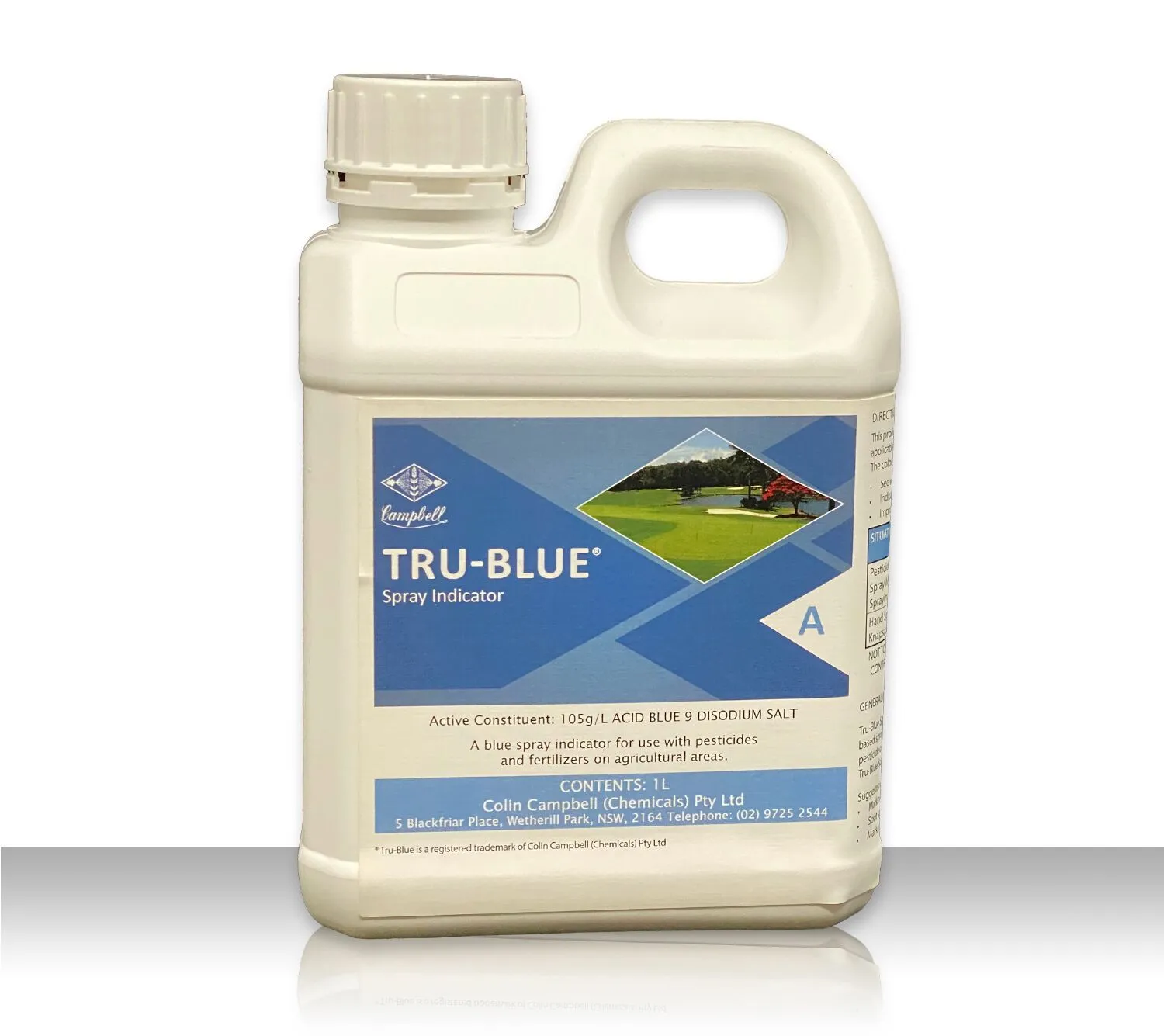 Tru-Blue is a blue spray pigment that can be used with spray applications to ensure even application on your lawn or prevent over application, by seeing which weeds have been treated when spot spraying.